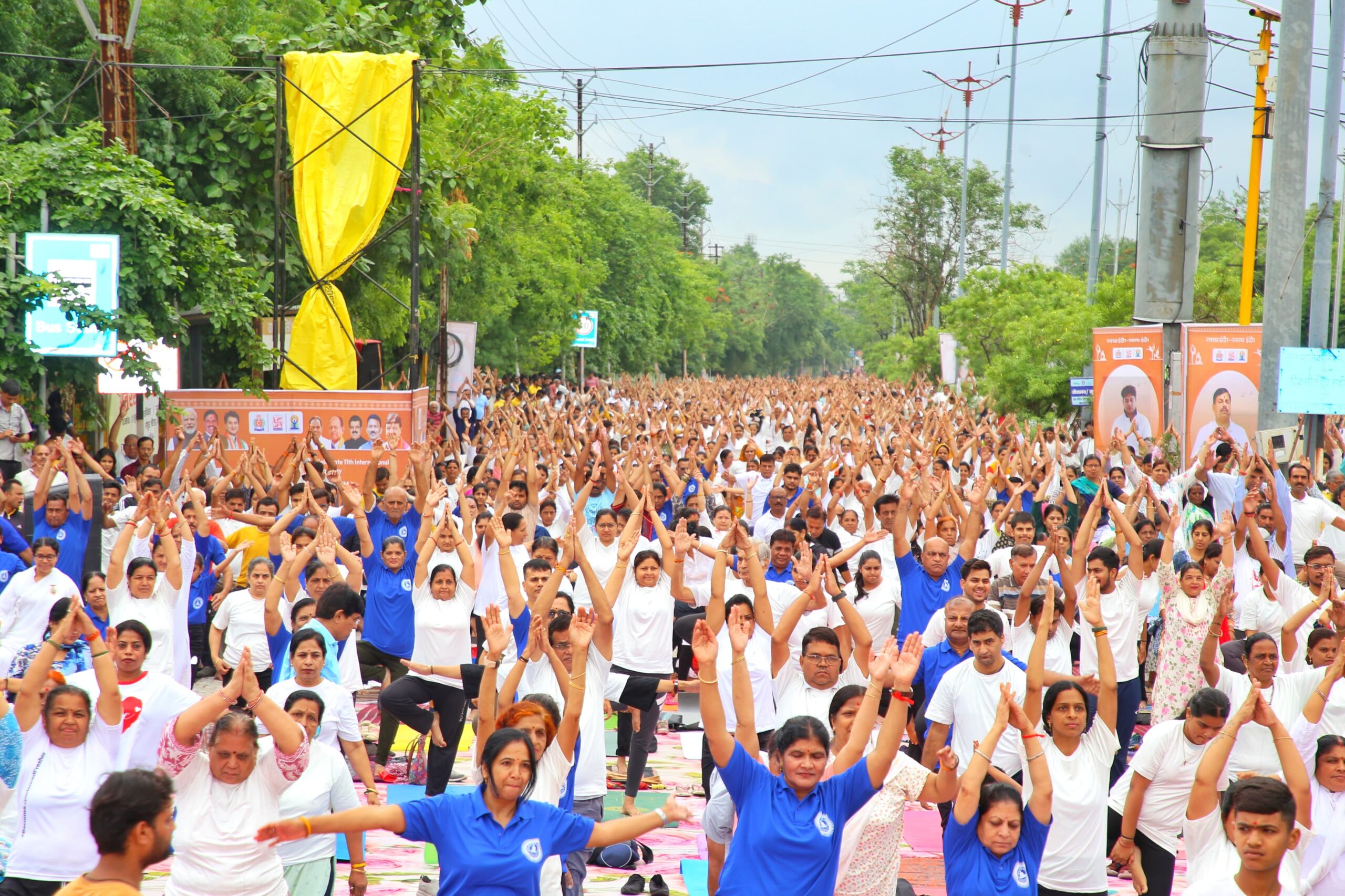 गोपुर नगर चौराहा स्थित आयोजन स्थल पर पांव रखने की भी जगह नहीं थी। दरअसल शहर के 85 वार्डों के 9 हजार से ज़्यादा योग मित्र सदस्य उक्त आयोजन में शामिल थे। इस अवसर पर केंद्रीय मंत्री ज्योतिरादित्य सिंधिया,नगरीय प्रशासन मंत्री कैलाश विजयवर्गीय और महापौर पुष्य मित्र भार्गव, नगर अध्यक्ष सुमित मिश्रा,राउ विधायक मधु वर्मा,निगम जल कार्य समिति प्रभारी अभिषेक बबलू शर्मा,महापौर प्रतिनिधि भरत पारीख,सचेतक कमल वाघेला सहित अनेक भाजपा नेता भी इस आयोजन में शामिल हुए।