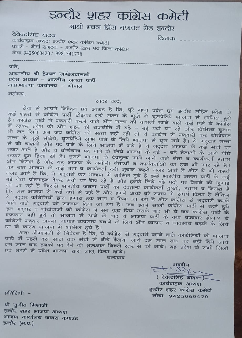 7 जुलाई को मध्यप्रदेश भाजपा के नव नियुक्त प्रदेश अध्यक्ष हेमंत खंडेलवाल इंदौर आने वाले हैं। इसे लेकर विधानसभावार भाजपाई शक्ति प्रदर्शन की तैयारियों में मशगूल हैं। ताकि प्रदेश अध्यक्ष के सामने उनकी झांकी जमने में कोई कसर न रहे हैं वहीं दूसरी तरफ इंदौर कांग्रेस से जुड़े कार्यवाहक अध्यक्ष देवेंद्र सिंह यादव ने जहां कांग्रेस छोड़कर भाजपा में भागे पूर्व कांग्रेसियों को भेड़िया, सत्ता और पद के लिए दुम हिलाने वाले श्वान तक करार दे दिया हैं और यादव ने सीधे तौर पर प्रदेश भाजपा अध्यक्ष हेमंत खंडेलवाल को पत्र जारी करते हुए अपील की है कि वह कांग्रेस से भाजपा में आयातित हुए पूर्व कांग्रेसियों को बिल्कुल भी सम्मान और पद से नहीं नवाजे। दरअसल यादव का इसके पीछे तर्क है कि इससे भाजपा के ही वर्षों पुराने देवतुल्य कार्यकर्ता दुखी है तो भाजपा में शामिल हुए यह कांग्रेसी सिर्फ और सिर्फ सत्ता,पद के लिए दुम हिलाएंगे ही। लेकिन उन्हें वर्षों पुराने कार्यकर्ताओं की खातिर कोई तवज्जो न देवें।