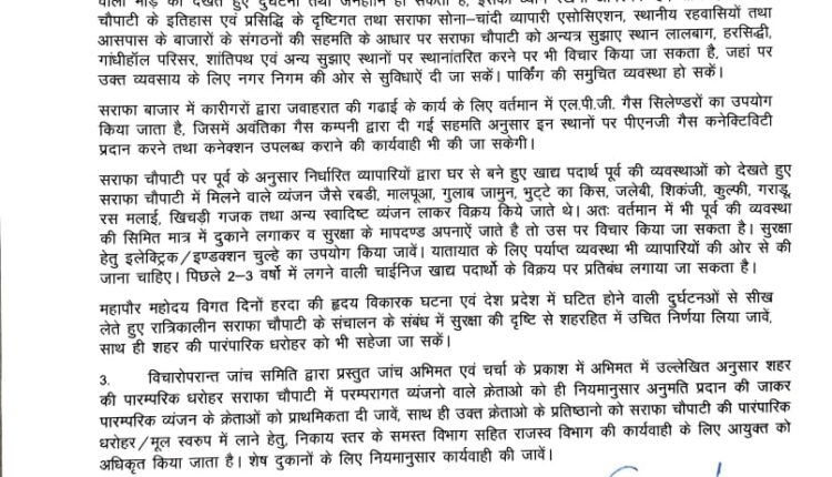शहर की पारंपरिक सौगात सराफा चौपाटी मामले को लेकर आम जनता को काफी ज्यादा भ्रमित किया जा रहा है, निगम जांच समिति जो कि 27 फरवरी 2024 को बनाई गई थी। उसे लेकर बताया जा रहा है कि समिति ने सराफा चौपाटी की पारंपरिक दुकानों को शिफ्ट करने की दलील दी थी। जबकि जांच समिति सदस्यों जिनमें MIC सदस्य राजेंद्र राठौड़,निरंजन सिंह चौहान,अश्विनी शुक्ला और राकेश जैन थे। उन्होंने सराफा चौपाटी को लेकर 200 से ज्यादा दुकानों को लेकर सुरक्षा,पार्किंग और व्यवस्थाओं को लेकर राय दी थी कि सराफा चौपाटी में पारंपरिक दुकानों के अलावा अन्य फास्ट फूड दुकानों को हटाया जाएं। क्योंकि यह दुकानें आम शहरवासी के स्वास्थ्य के लिए भी उचित नहीं हैं। और इनकी वजह से सराफा चौपाटी का मूलस्वरूप बिगड़ गया हैं। लिहाजा समिति सदस्यों ने महापौर पुष्यमित्र भार्गव से पारंपरिक दुकानों को छोड़ अन्य दुकानों को हटाने की बात कहीं थी।
