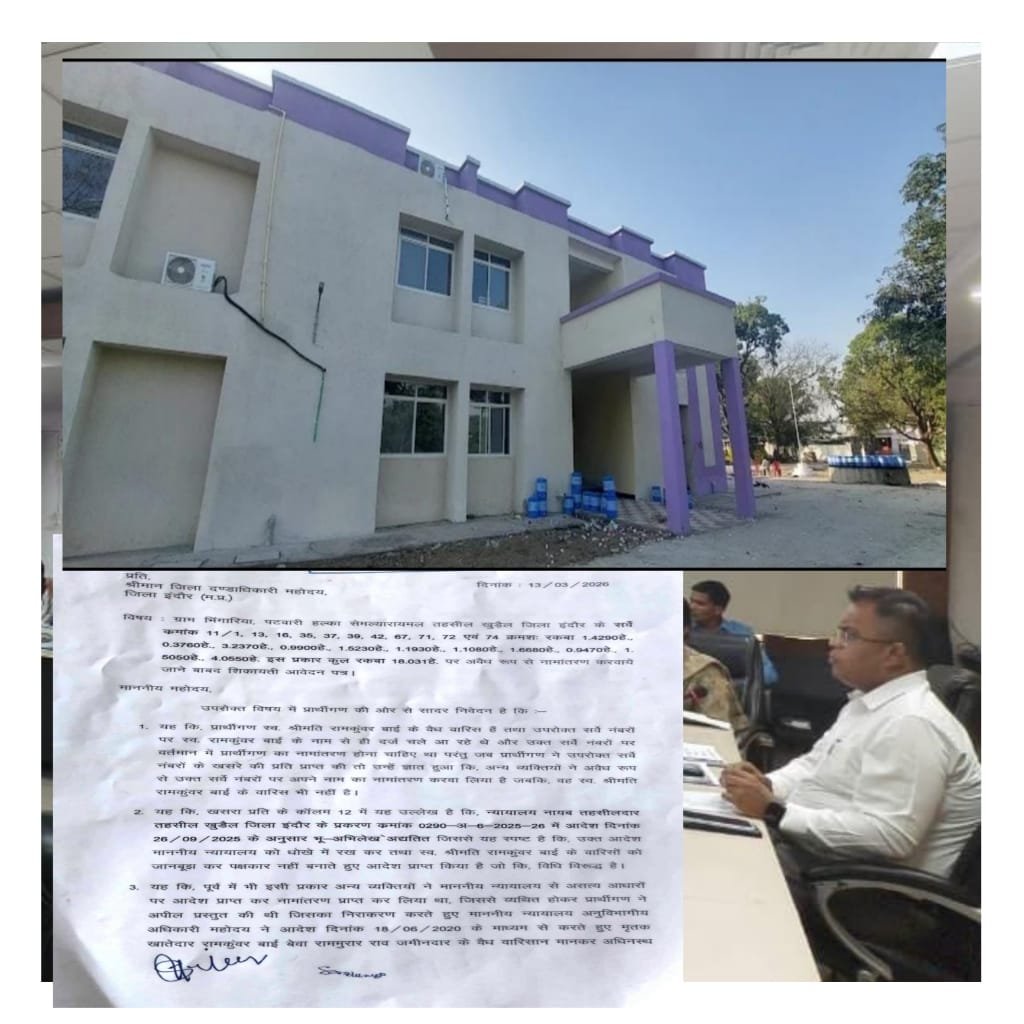 इंदौर कलेक्टर शिवम वर्मा राजस्व अमले सहित अन्य अपने कनिष्ठ अधिकारियों को अच्छा कार्य करने के लिए सम्मानित कर रहे हैं। और लापरवाही,गलत कार्य करने वालों पर कार्यवाही की बात कर रहे हैं। लेकिन वहीं दूसरी तरफ राजस्व अमला लापरवाही, मिलीभगत,और बंदरबांट से बाज नहीं आ रहा हैं। दरअसल खुड़ैल तहसील के एक मामले ने खुड़ैल एसडीएम,तहसीलदार, पटवारी और पूरे तहसील कार्यालय स्टॉफ की पोल खोलकर रख दी। दरअसल वह इसलिए क्योंकि पटवारी तहसीलदार और एसडीएम की मिलीभगत के चलते खुड़ैल तहसील अंतर्गत आने वाले भिंगारिया क्षेत्र की 18 हेक्टेयर से ज्यादा जमीन पर इन सभी की मिलीभगत के चलते किसी दूसरे की जमीन पर सरकारी अमले ने फर्जी नामांतरण कर डाला। लिहाजा अब एसडीएम तहसीलदार और पटवारी भागते भागते और मुंह छिपा रहे हैं।