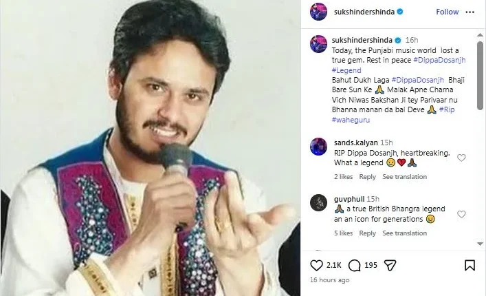 मशहूर पंजाबी गायक, संगीतकार और रिकॉर्ड निर्माता सुखशिंदर शिंदा ने सोशल मीडिया पर पोस्ट शेयर गायत दीपा दोसांझ के निधन पर दुख व्यक्त किया है। उन्होंने पोस्ट शेयर कर लिखा, ”आज पंजाबी संगीत जगत ने एक सच्चा रत्न खो दिया। आपकी आत्मा को शांति मिले ‘दीपा दोसांझ’ लीजेंड… बहुत दुख लगा दीपा दोसांझ भाजी बारे सुन के।”
